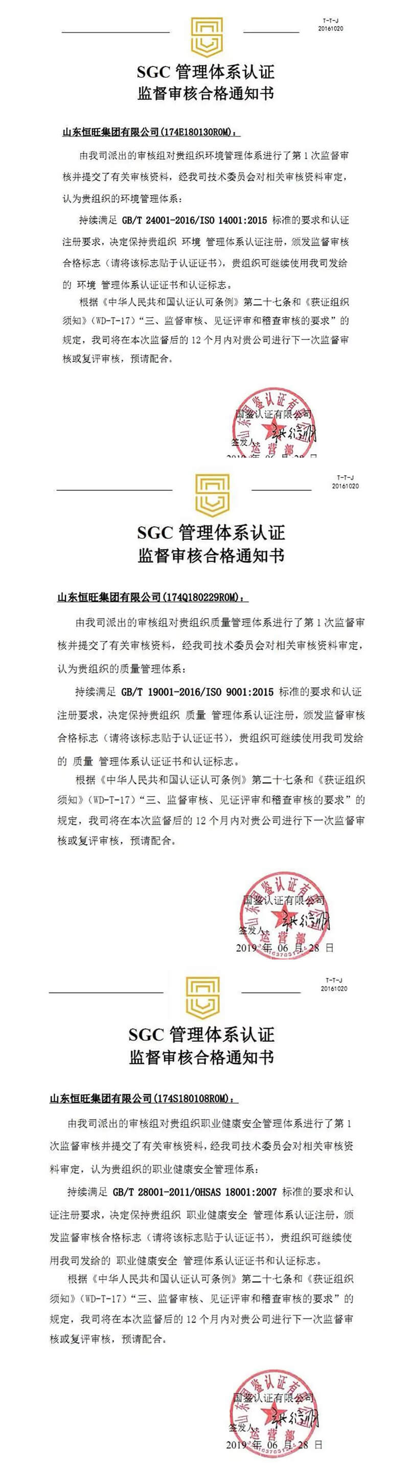 Recently, our group ushered in a review team of Shandong Guojian Certification Co., Ltd. The audit team conducted an annual certification supervision audit of our group ISO9001-2015 quality management system, ISO14001-2015 environmental management system, GB/T28001-2011occupational health and safety management system.